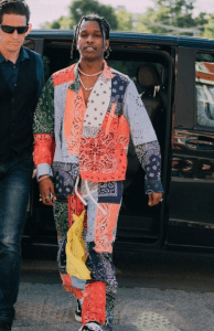 2018 was the year where A$AP Rocky himself redefined the newest fashion trends, BANDANAS! He wore the beautifully crafted bandana ensemble during Paris Fashion Week while attending the Dries van Noten show. Who knew that shortly after, Bandanas would become one of the newer trends, showing A$AP’s influence in fashion. Bandana shirts shortly after were sold online and in stores, such as Zara. His outfit creates an upbeat and positive vibe with many different colors that blend well together.