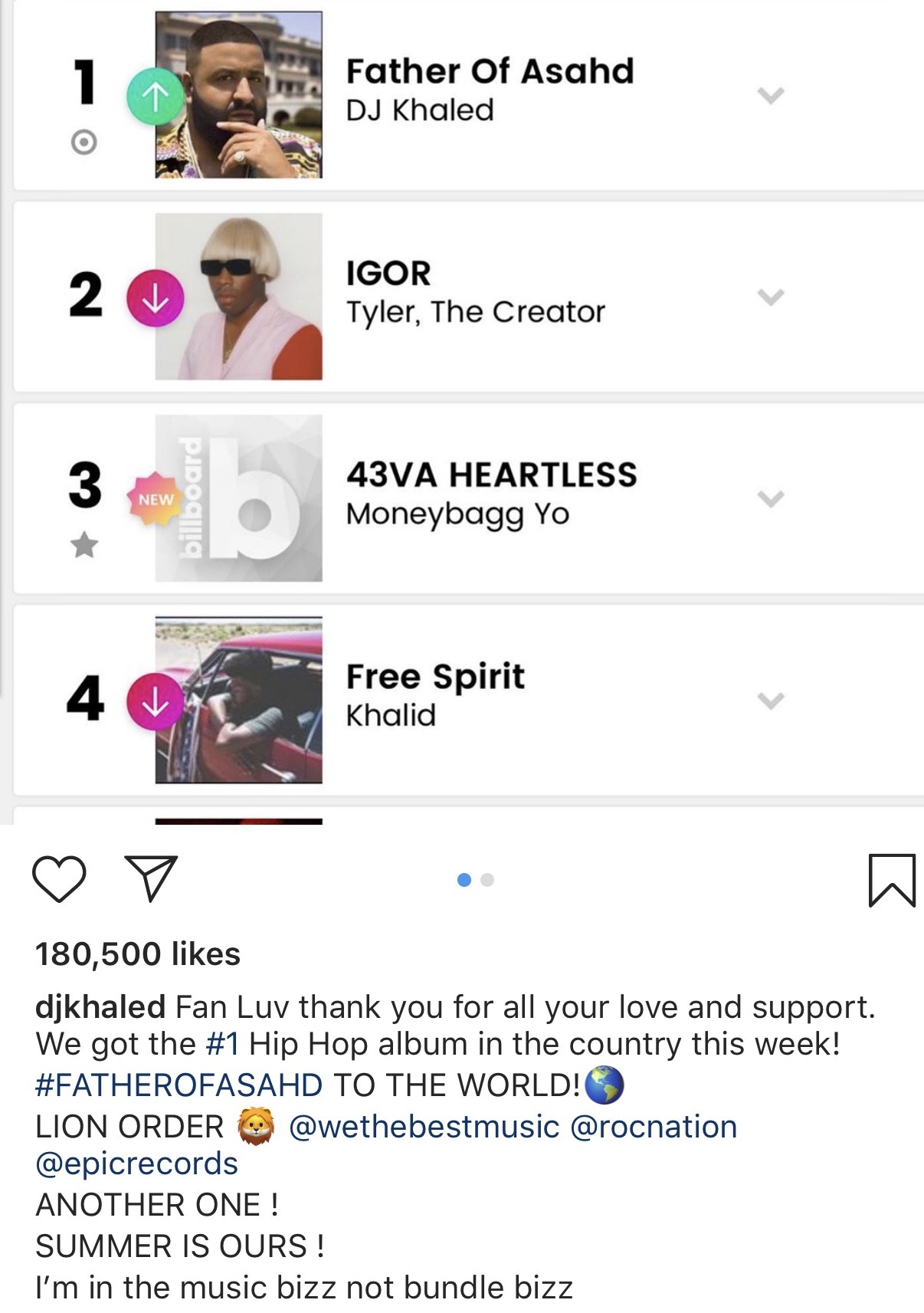 Khaled is planning to hit Billboard with a huge lawsuit. He claims that Billboard allegedly disqualified 100,000 sales unfairly. That action robbed Father of Asahd of the #1 spot on the charts. Khaled’s album came with a bundle deal with an energy drink. Tyler’s album had 4 bundle deals and was credited with those sales. Father of Asahd cost about $5 Million to market and record. The guest appearances such as Beyoncé, Jay-Z, Lil Wayne, Travis Scott, Post Malone and many more aren’t cheap. Having that blockbuster lineup and not securing the #1 spot is equal to a big budget movie flopping.