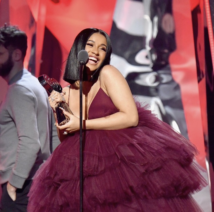 Dressed in a beautiful white gown made by Christian Siriano, the first half of the performance of “Be Careful” only showed a tight shot of Cardi’s face and upper body under the spotlight and after the 1st few stanzas, the camera zooms out, the audience screams with delight as Cardi finally reveals her baby bump for the world to see. Cardi was later seen celebrating her new found freedom as she is overheard yelling “I’m finally free” popsugar.com