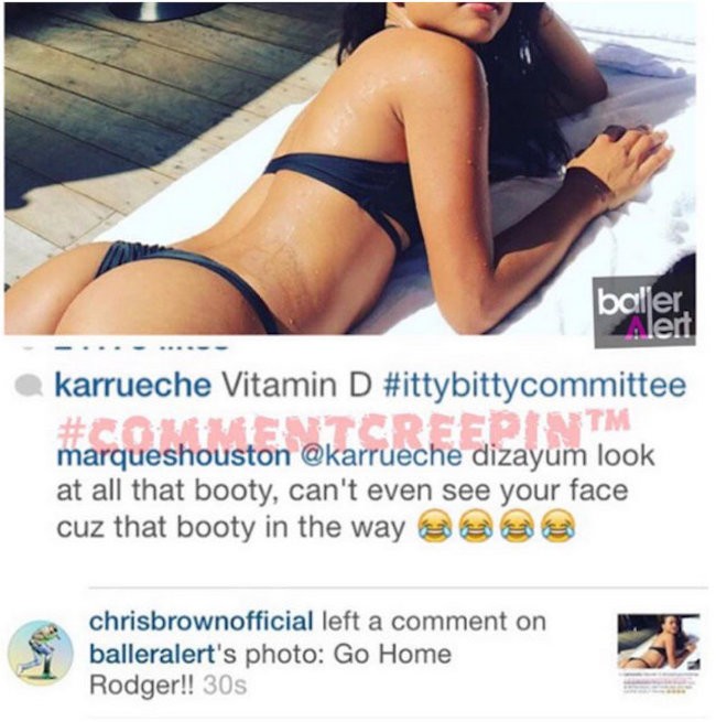 Chris Brown had to check Marques Houston on his thirsty comment under Karrueche’s lusty Instagram post. The model and former ex-girlfriend of Chris Brown posted a picture of herself wearing a tiny black bikini with a caption that read, “Vitamin D #ittybittycommittee.” Houston couldn’t just scroll past the photo without expressing his praise for her glossy booty commenting,