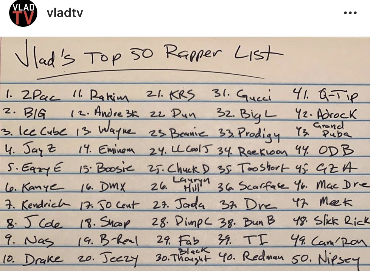 Everyone was dropping a top 50 list without any rhyme or reason. Are we going off talent? What about song making ability? How about rappers in groups? What about rappers that have songs in other genres? I had a lot of questions about this debate. Like what about rappers that had ghost writers? Kanye and Drake are dope, but had a team of writers. Eazy-E is a legend, but Ice Cube wrote his lyrics. Rappers in groups are another one as well. I love Mobb Deep as a group and I am divided on the late great Prodigy’s solo career. Big Boi has released more solo projects than Andre 3000. Wu-Tang is another problem. Certain guys in the group stand out and everyone has their favorite member. Another debate is a guy like Wiz Khalifa always has a record in circulation, will always have solid albums and following, but a person will rate Canibus higher because of his verse on “5,4,3,2,1” and a few legendary freestyles.