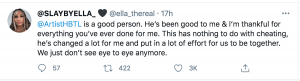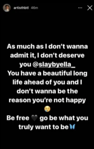 “As much as I don’t wanna admit it, I don’t deserve you, @slaybella_,” the rapper wrote. “You have a beautiful long life ahead of you, and I don’t wanna be the reason you’re not happy. Be free, go be what you truly want to be.”