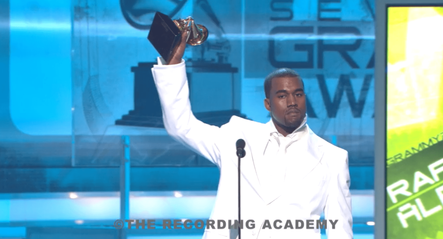 Kanye’s first Grammy! Screenshot of 2005 video from https://www.grammy.com/grammys/videos/2005-grammys-kanye-west-wins-best-rap-album.