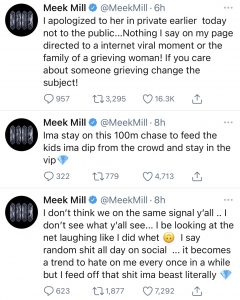 Mr. Mill, sir, did you think about their family as you wrote that line? Did you think of the hurt it would cause that grieving family as you RECORDED the verse? Did you think at all?? The answer is no, so you do not get to take the moral high ground and tell US to think of them when you created this metaphoric dumpster fire. Please, put your phone down. Let this simmer before throwing your hat back in the ring for another round.