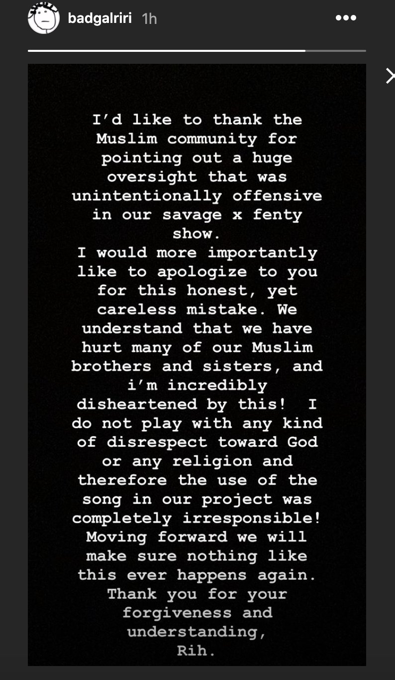 Rihanna issued an apology on her Instagram story on October 6th, promising that this would never happen again and stating how she did not mean to offend anyone by any means.