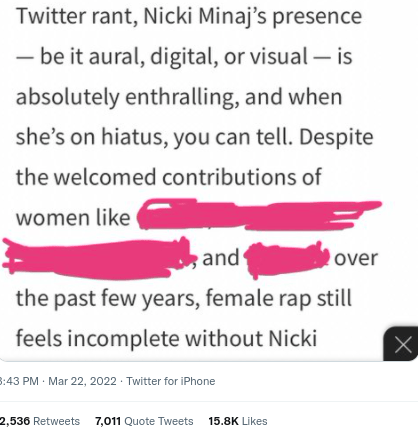 Nicki Minaj posted this passage along with a praying hands emoji and a few eyebrow-raising edits to social media. According to the screenshot posted on her Twitter, her fellow female artists’ names have been scribbled without reason.
