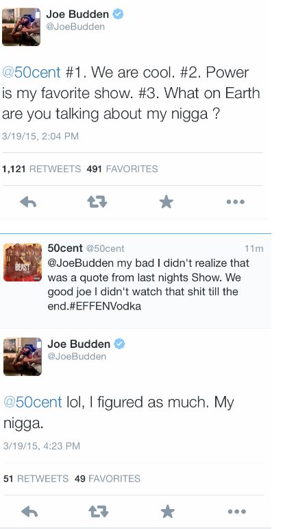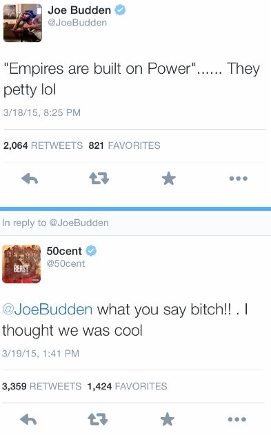 50 Cent is out for any one who has something to say about his show Power even to rapper friend Joe Budden who he called a bitch on Twitter. Joe Budden tweeted a tagline from the show Empire but 50 caught some feelings over it. Turns out that the whole thing was a misunderstanding and the two rappers are still cool.